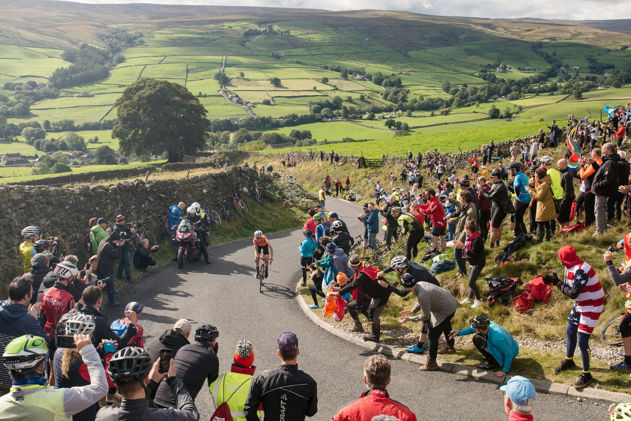 I spent a few damp days recceing some of the courses, but you can only do so much. The rest is in the lap of the weather gods. The Women’s Elite race went to plan with a great vantage point on the climb to Lofthouse in glorious sunshine. The expectant crowds and press were witnessing the decisive move from Annamieke van Vleuten 100km from the finish.
